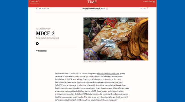 ‘টাইম শ্রেষ্ঠ উদ্ভাবন ২০২৫’-এর সম্মান পেল আইসিডিডিআরবি ও ওয়াশিংটন ইউনিভার্সিটির উদ্ভাবিত অন্ত্র সুস্থকারী খাবার।