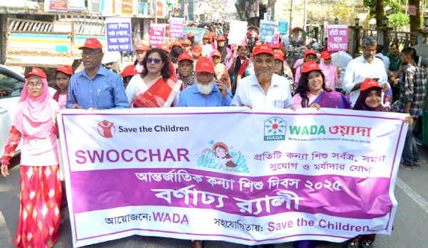 সেভ দ্যা চিলড্রেন ইন্টারন্যাশনাল এর সহযোগিতায় উন্নয়ন সংস্থা ওয়াদা’র আয়োজনে আজ বৃহস্পতিবার বরিশাল শহরে বর্নাঢ্য র্যালি ও বিডিএস ক্লাবের সভা কক্ষে কন্যা শিশু অধিকার বিষয়ক কর্মশালা অনুষ্ঠিত হয়।