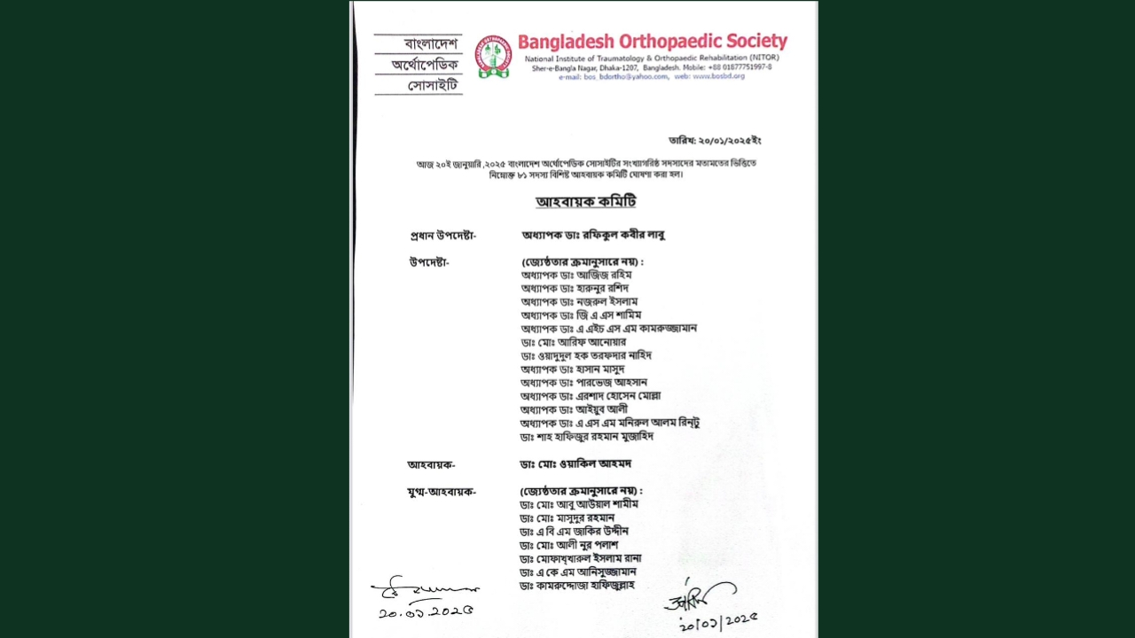 আজ ২০ই জানুয়ারি সোমবার বাংলাদেশ অর্থোপেডিক সোসাইটির সংখ্যাগরিষ্ঠ সদস্যদের মতামতের ভিত্তিতে ৮১ সদস্য বিশিষ্ট আহবায়ক কমিটি ঘোষণা করা হয়।