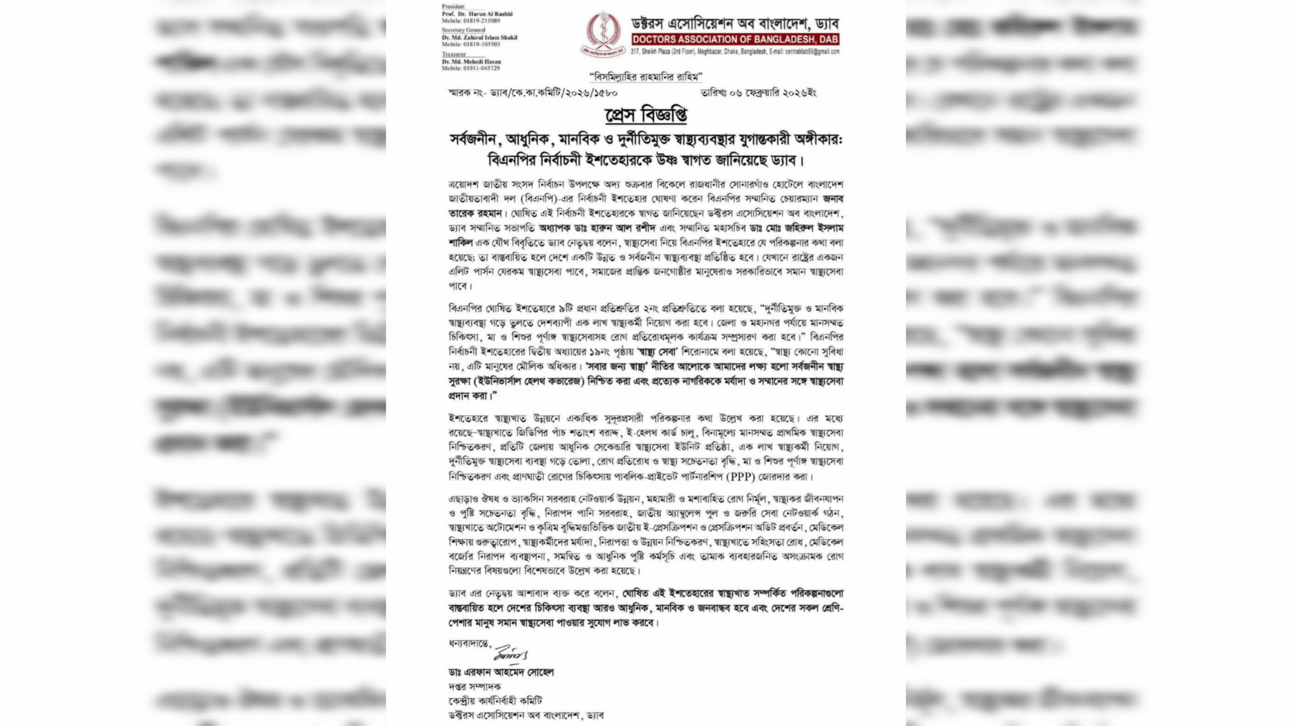 শুক্রবার বিকেলে রাজধানীর সোনারগাঁও হোটেলে বিএনপির সম্মানিত চেয়ারম্যান তারেক রহমান নির্বাচনী ইশতেহার ঘোষণা করেন। এ বিষয়ে ড্যাবের সভাপতি অধ্যাপক ডা. হারুন আল রশীদ এবং মহাসচিব ডা. মো. জহিরুল ইসলাম শাকিল যৌথ বিবৃতিতে বলেন, স্বাস্থ্যসেবা নিয়ে ইশতেহারে যে পরিকল্পনার কথা বলা হয়েছে তা বাস্তবায়িত হলে দেশে একটি উন্নত ও সর্বজনীন স্বাস্থ্যব্যবস্থা প্রতিষ্ঠিত হবে।