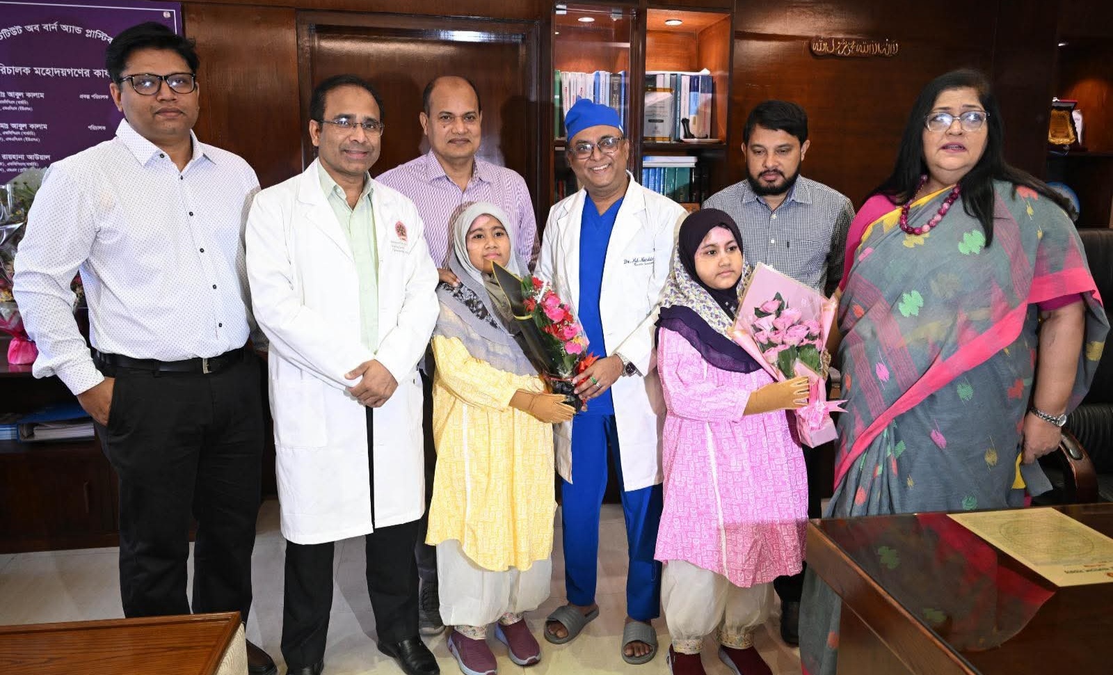 জাতীয় বার্ন অ্যান্ড প্লাস্টিক সার্জারি ইনস্টিটিউটে প্রায় সাড়ে তিন মাস চিকিৎসাধীন থাকার পর বাড়ি ফিরলেন মাইলস্টোন স্কুল অ্যান্ড কলেজে প্রশিক্ষণ বিমান বিধ্বস্তের ঘটনায় আহত দশ বছর বয়সী যমজ শিশু সারিনাহ জাহান সায়রা ও সাইবাহ জাহান সায়মা।