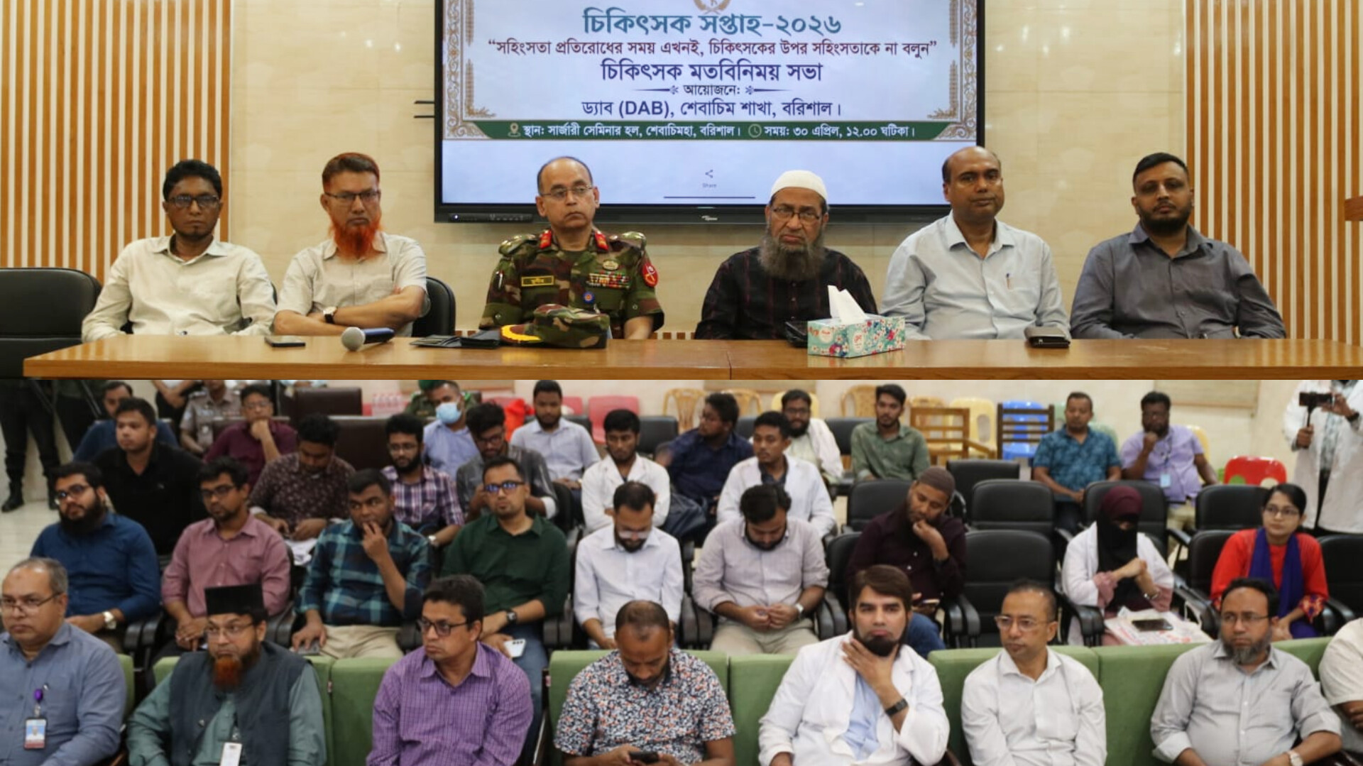 আজ বৃহস্পতিবার বেলা ১২টায় শের ই বাংলা মেডিকেল কলেজ হাসপাতাল সার্জারী সেমিনার হলে ডক্টরস অ্যাসোসিয়েশন অব বাংলাদেশ (ড্যাব) শেবাচিম শাখার আয়োজনে এই চিকিৎসক মতবিনিময় সভা অনুষ্ঠিত হয়।